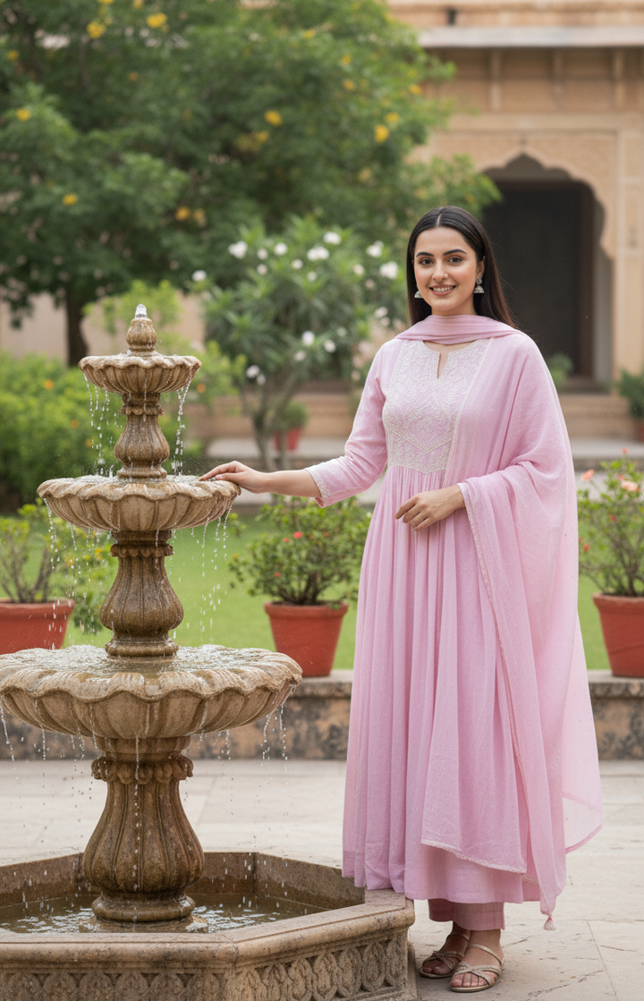 Kurta: Made in soft muslin fabric with a breathable mul cotton lining, ensuring comfort while maintaining a rich look. The kurta is adorned with delicate machine thread work and sequin detailing, giving it a subtle festive sparkle. Styled with 3/4th sleeves, it offers both elegance and ease.