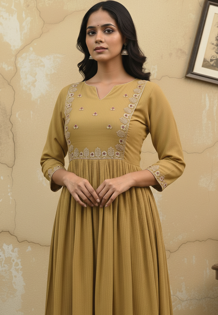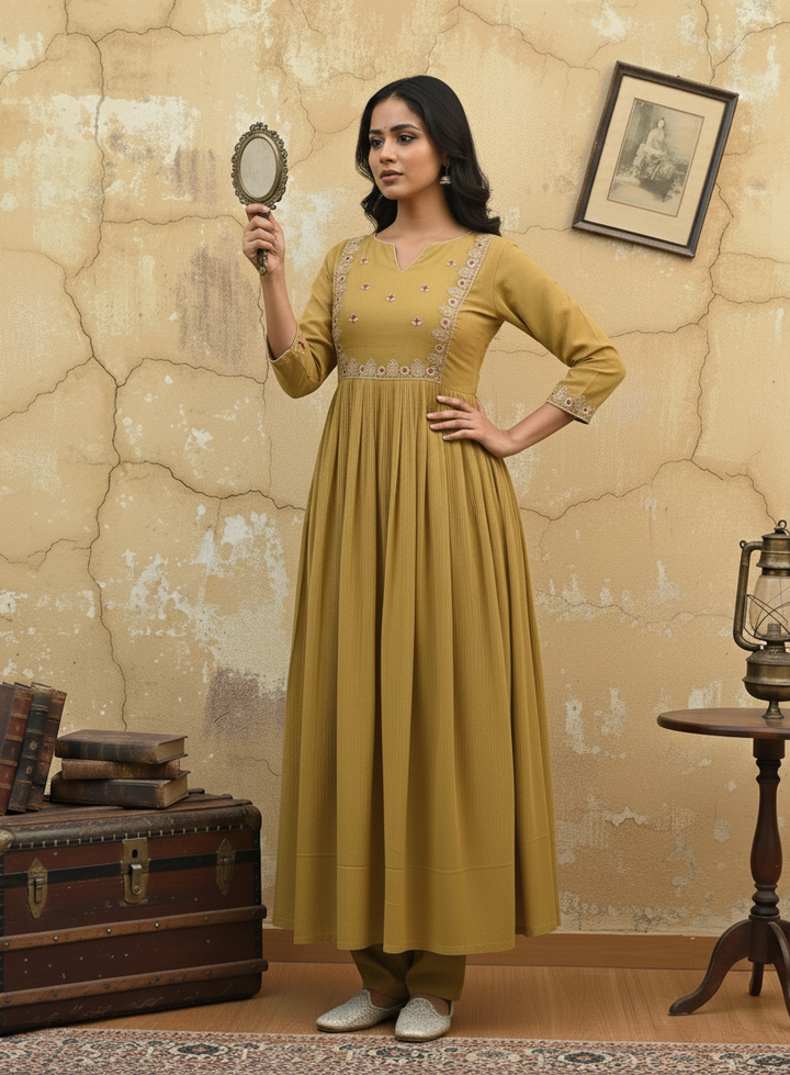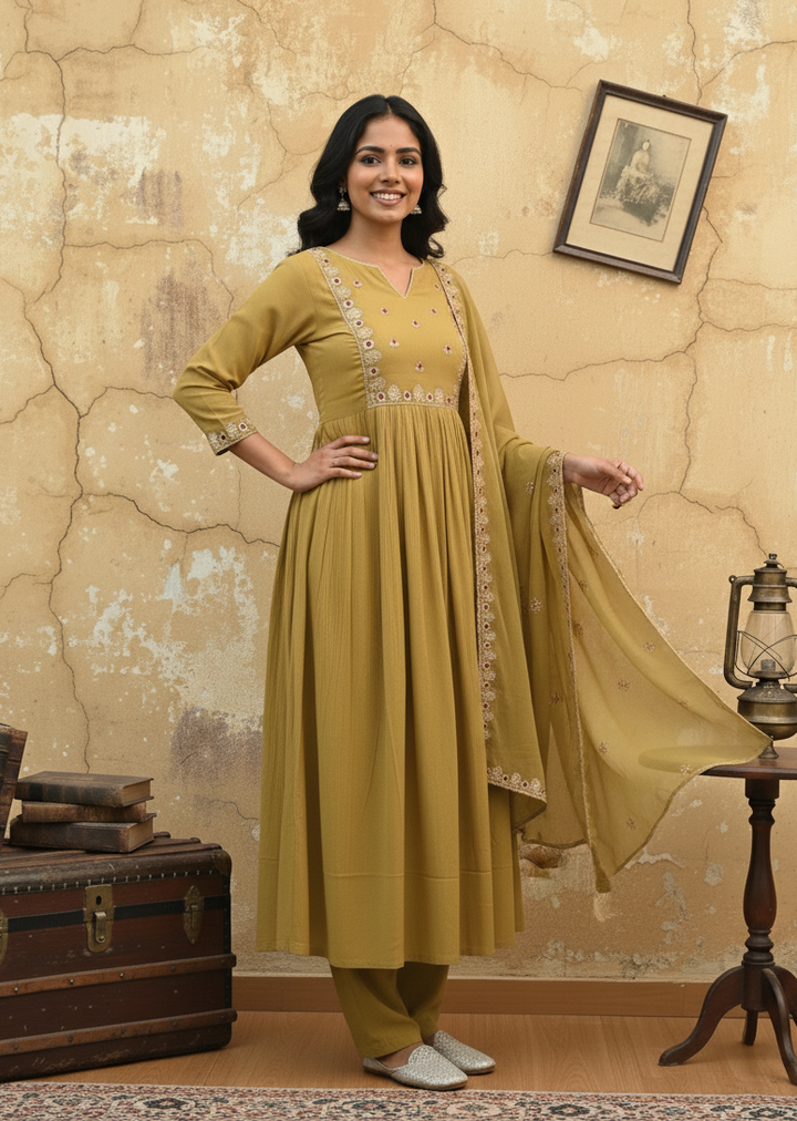 Dupatta: Comes with a lightweight mul chanderi dupatta, embellished with machine zari and thread work, completing the set with a festive sparkle.