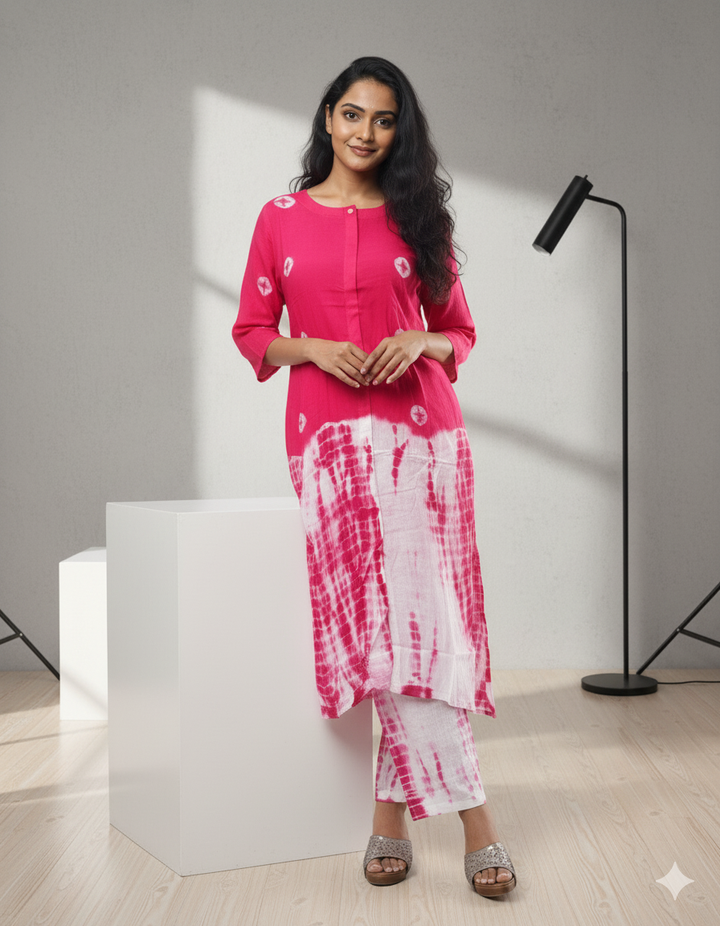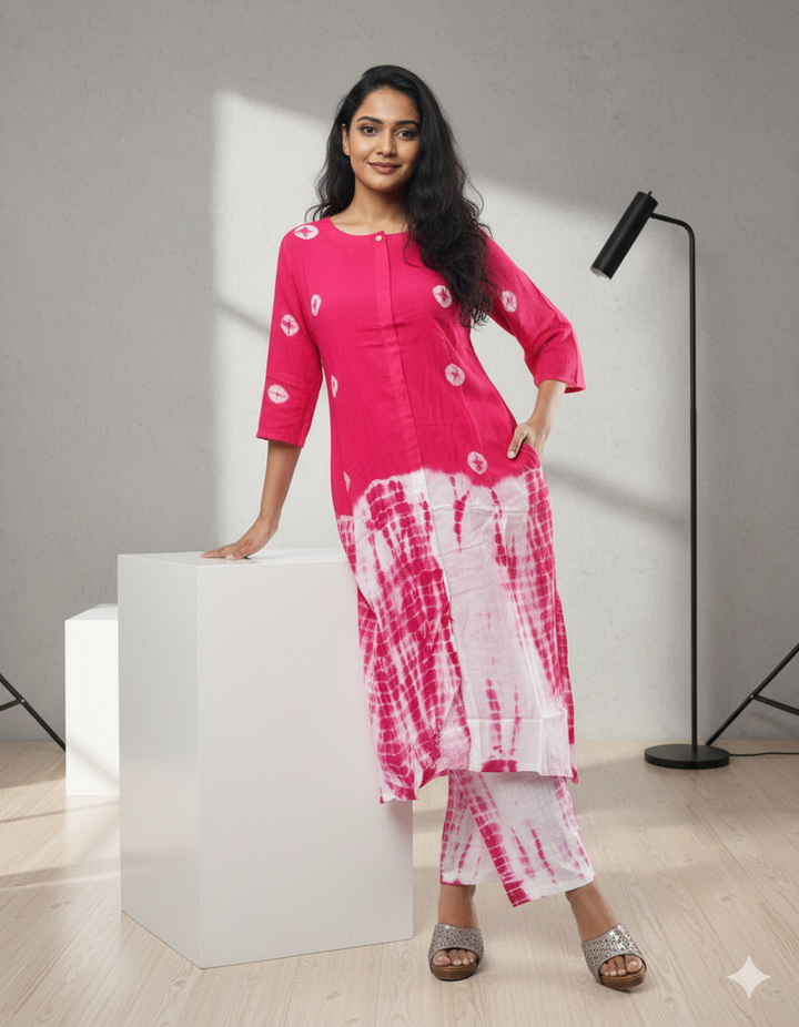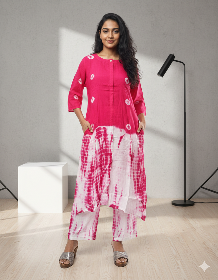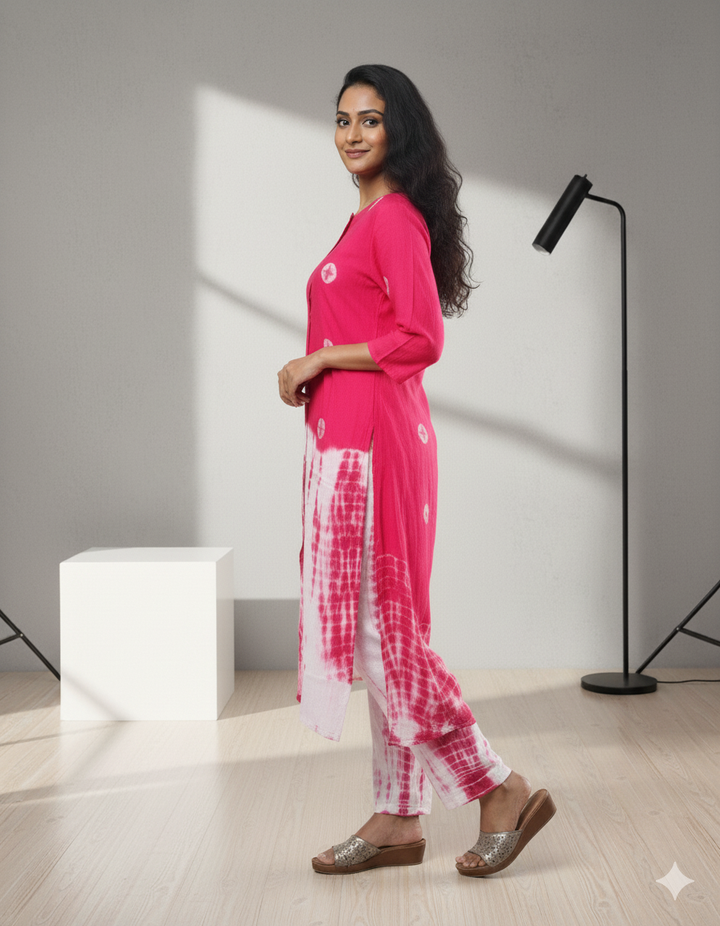 Brighten up your style with this stunning fuchsia pink co-ord set, designed in soft and breathable hand muslin fabric for all-day comfort. The set includes a kurta and matching pants with an eye-catching tie-dye design, giving it a modern yet ethnic touch.