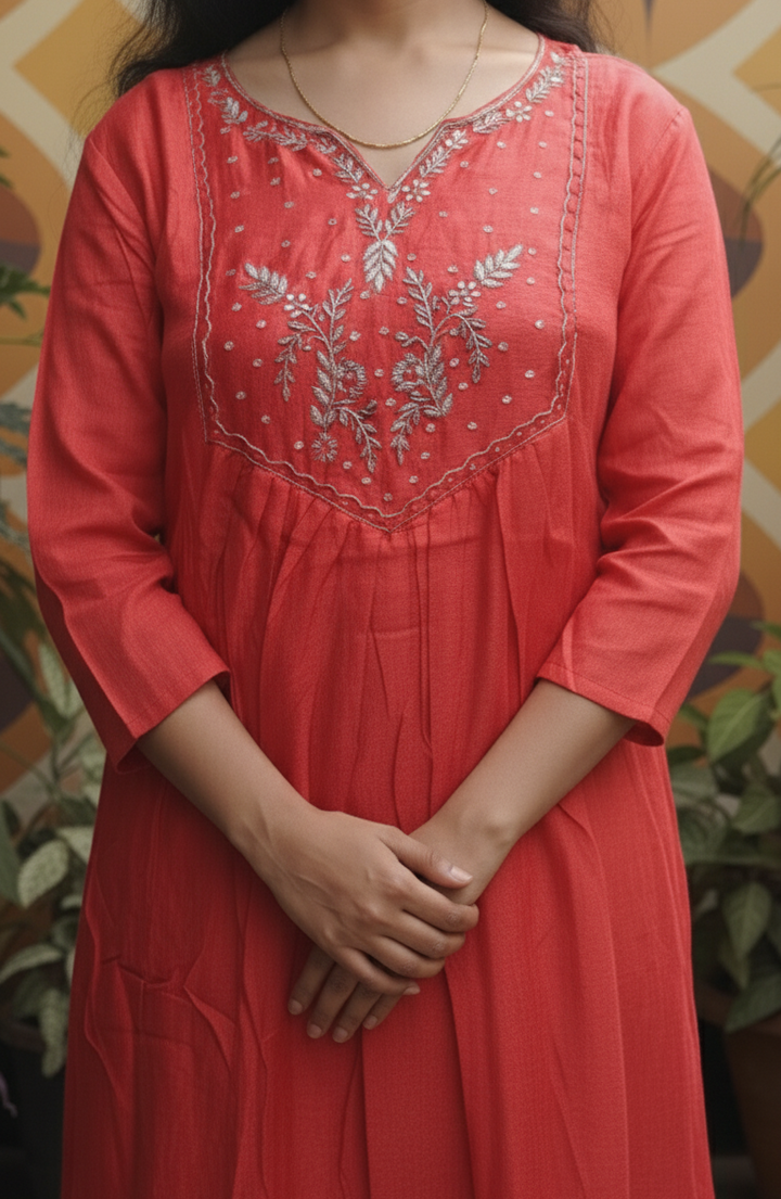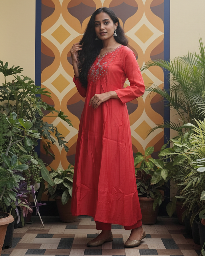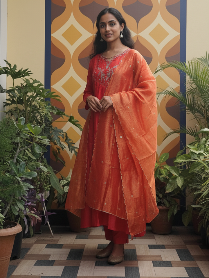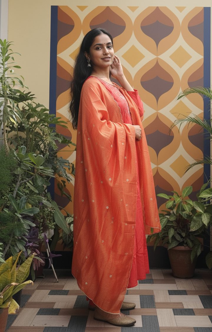 Elevate your ethnic wardrobe with this elegant rust-coloured 3-piece kurta set, crafted to perfection for festive occasions and celebrations.