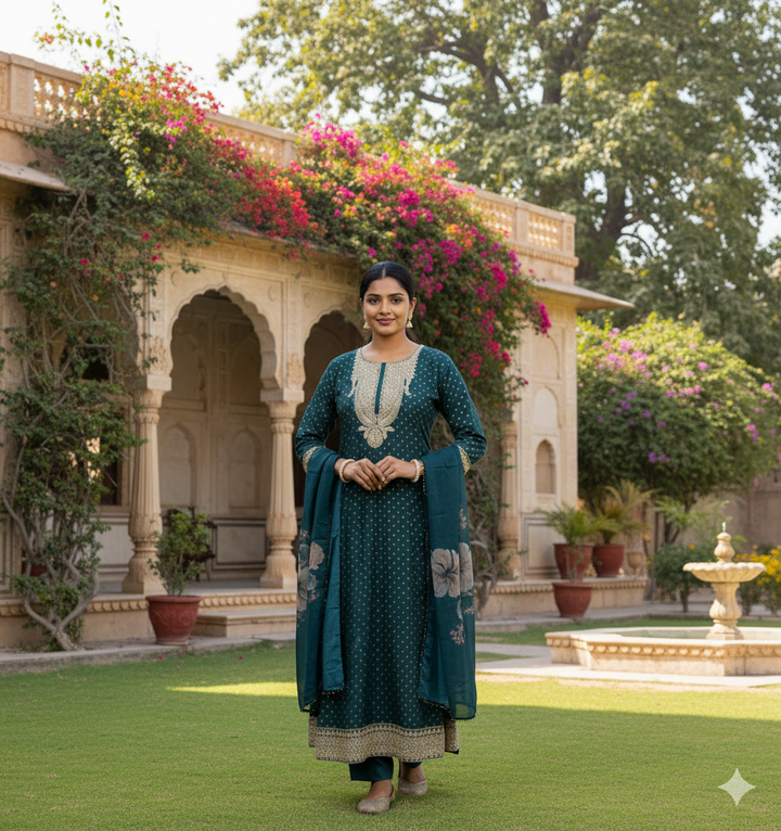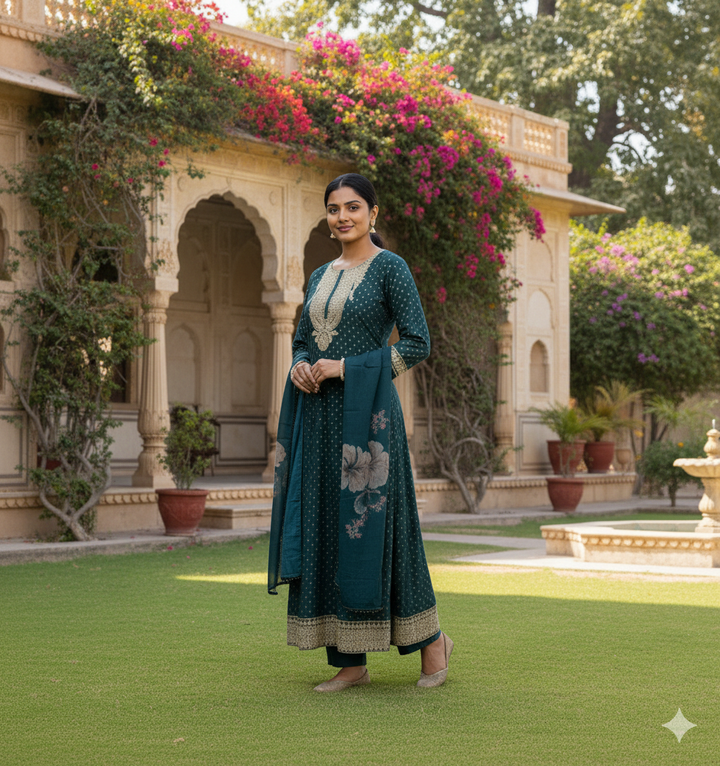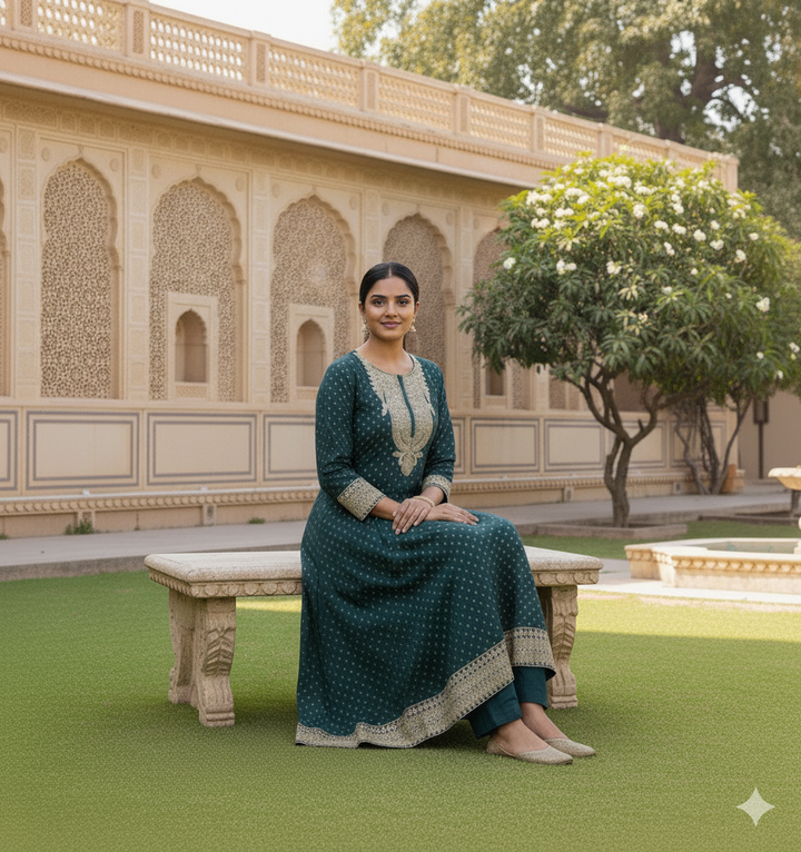 This outfit is a perfect blend of tradition and modern design, making it an ideal choice for weddings, festive celebrations, or special occasions. Style it with statement jewelry and heels to elevate your festive look effortlessly.